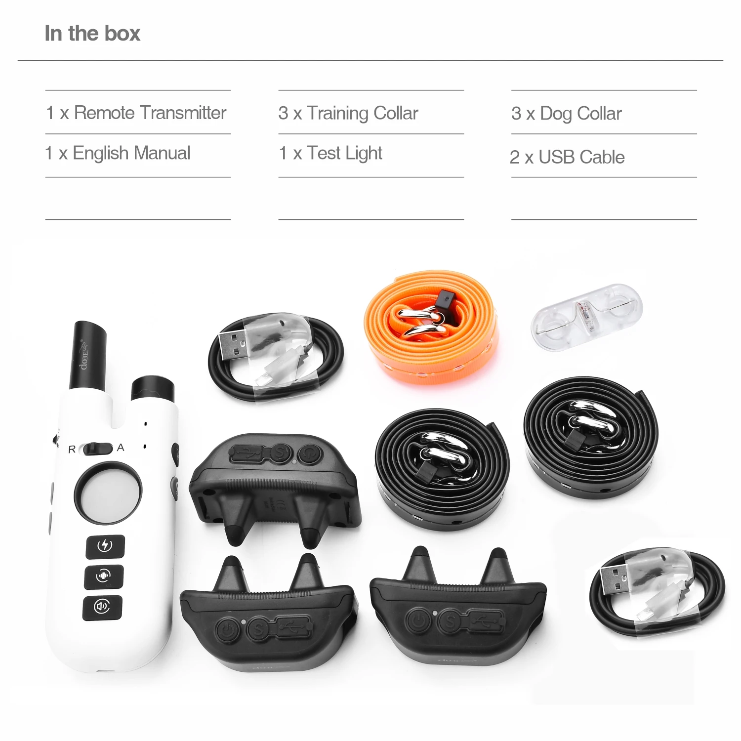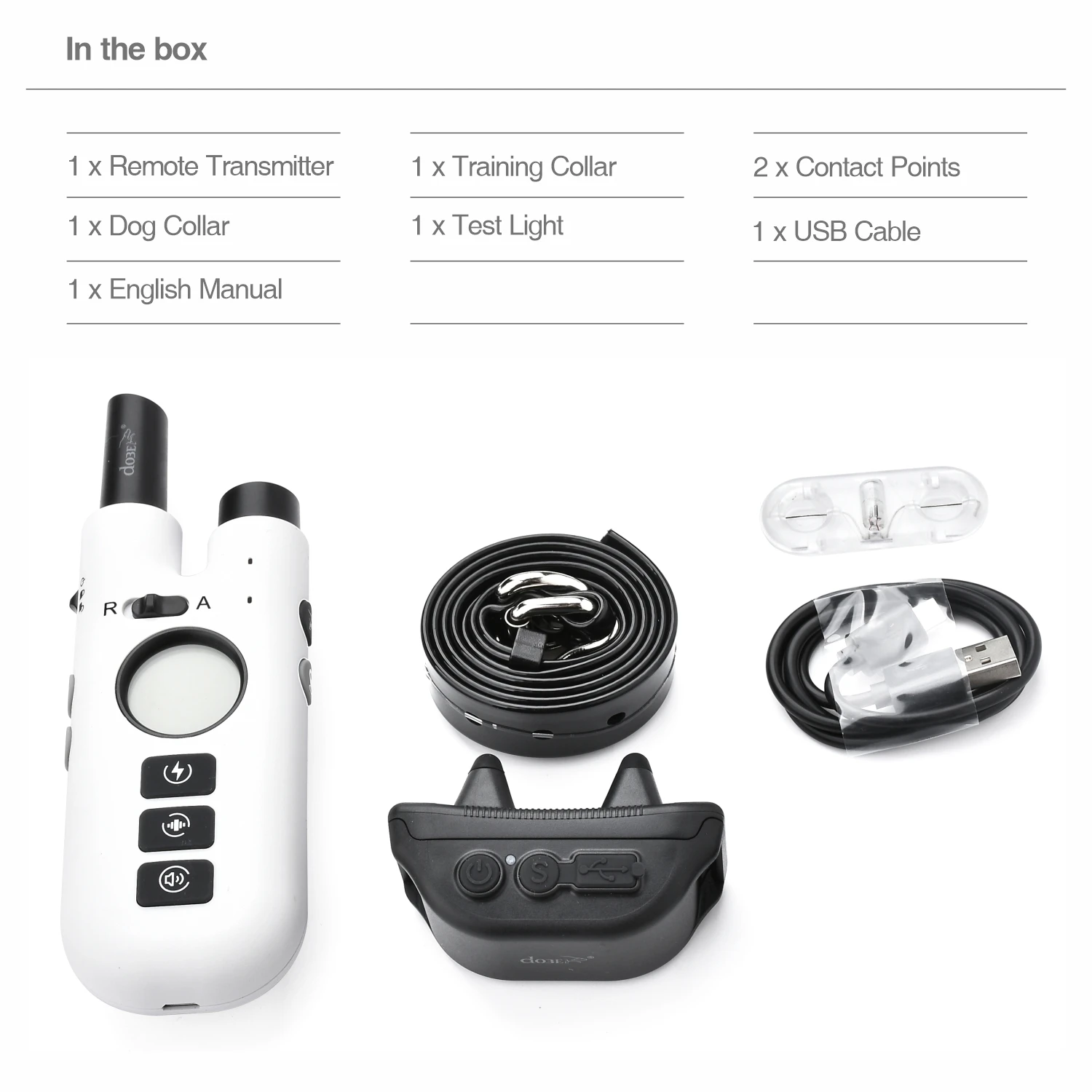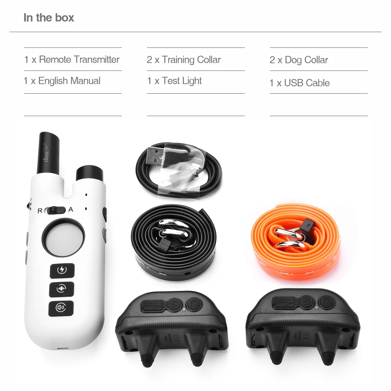 Dog Training Bark Collar 2 in 1 No Bark Control Collar 800M Rechargeable Dog Electric Collar Remote Waterproof Dog Pet Product1.Dog Bark Training Collar suitable for Small / Medium / Large dogs and Recommended for dogs from 15 to 120 pound dogs2.No Bark Control Collar with rechargeable and Waterproof, you pet can swim in the water.3.The 75cm TPU collar is adjustable length from 9" (23cm) to 25.6" (65cm)4.Expandable for 3 dogs with extra collar (optional)5.Dog Electric Collar Remote up to 800 meters remote control distance with no barriers6.Rechargeable Dog Electric Collar with 3 Training Models: Beep, Vibrate, Shock7. 99 intensity level of vibrate and shock for training model and anti bark mode8. 3 No Bark Models: Beeper, Vibrate, Shock9. Remote Training Bark Collar with backlight LCD display. Convenience of easy-to-read LCD screen shows the stimulation level10. Material: ABS+HardwareIn the box:1 x Remote Control 1 x Training Collar1 x Dog Collar 1 x USB Cable1 x English Manual 1 x Test Light Bulbs