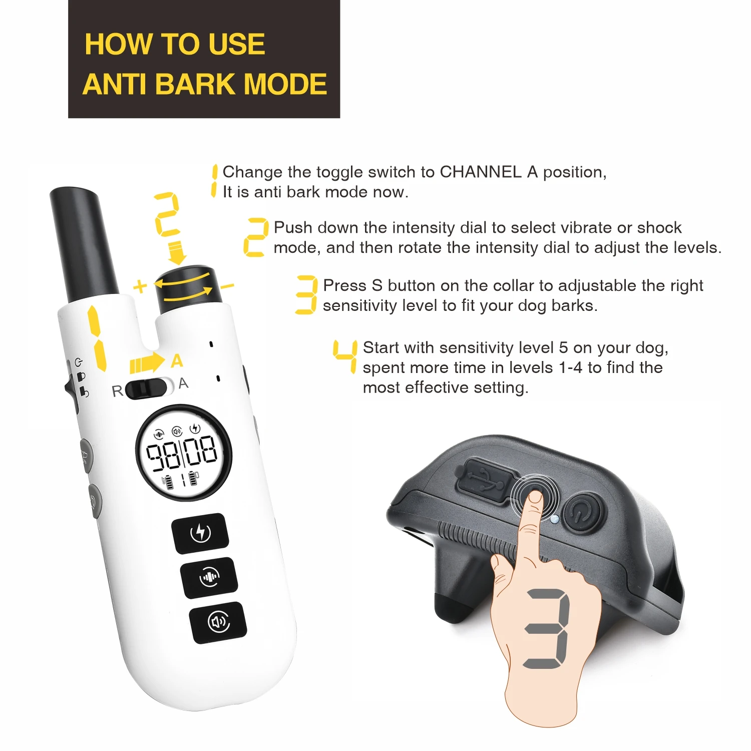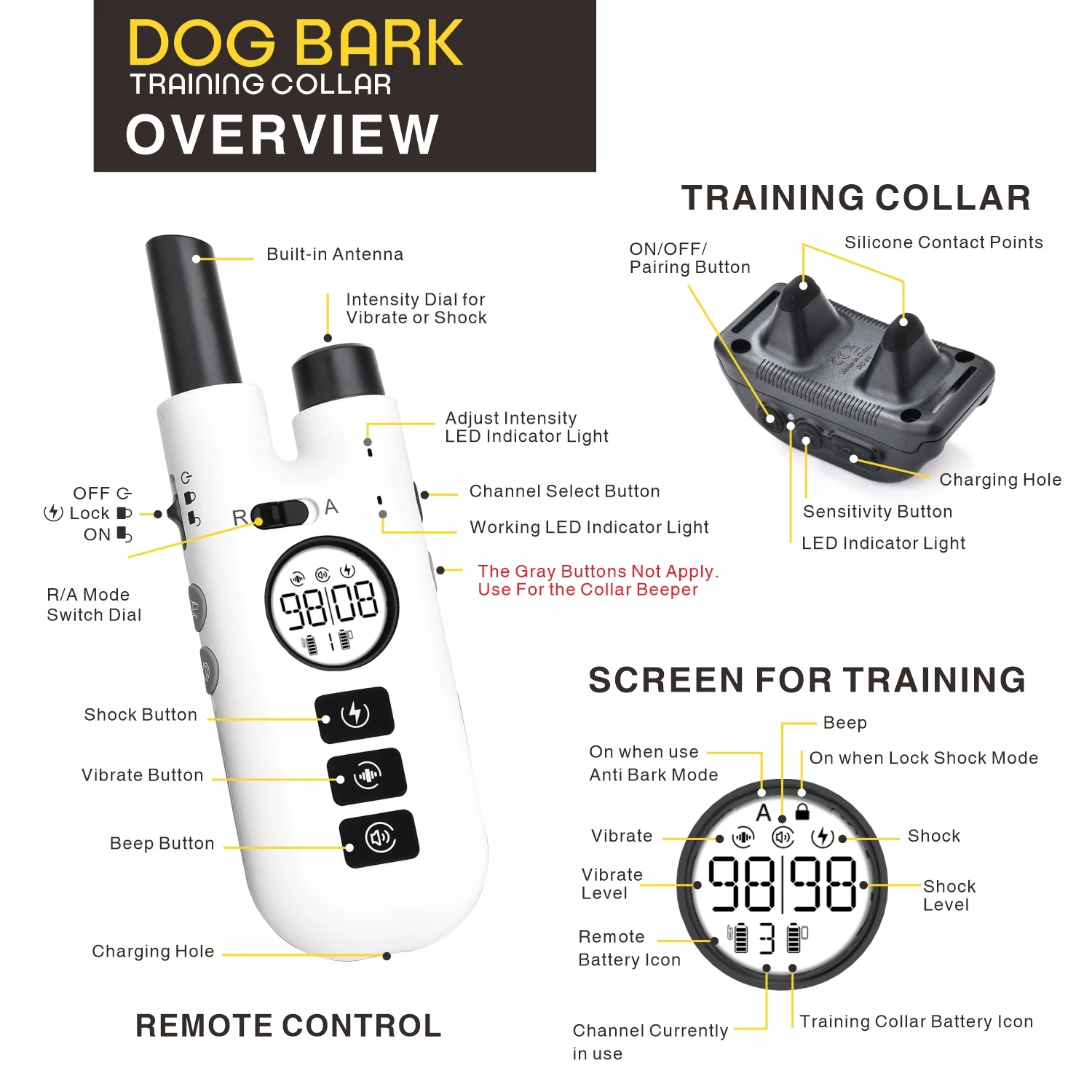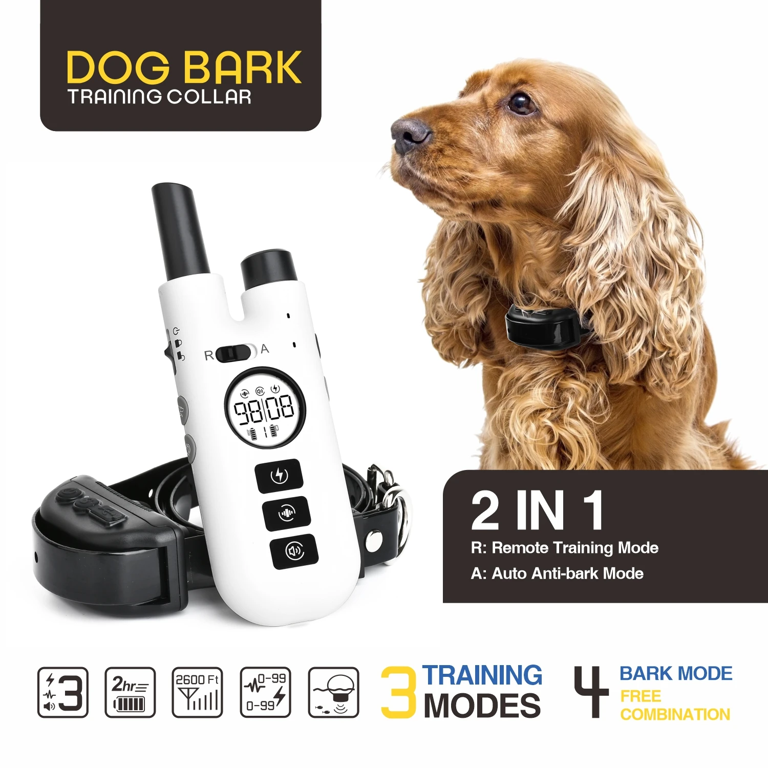 Dog Training Bark Collar 2 in 1 No Bark Control Collar 800M Rechargeable Dog Electric Collar Remote Waterproof Dog Pet Product1.Dog Bark Training Collar suitable for Small / Medium / Large dogs and Recommended for dogs from 15 to 120 pound dogs2.No Bark Control Collar with rechargeable and Waterproof, you pet can swim in the water.3.The 75cm TPU collar is adjustable length from 9" (23cm) to 25.6" (65cm)4.Expandable for 3 dogs with extra collar (optional)5.Dog Electric Collar Remote up to 800 meters remote control distance with no barriers6.Rechargeable Dog Electric Collar with 3 Training Models: Beep, Vibrate, Shock7. 99 intensity level of vibrate and shock for training model and anti bark mode8. 3 No Bark Models: Beeper, Vibrate, Shock9. Remote Training Bark Collar with backlight LCD display. Convenience of easy-to-read LCD screen shows the stimulation level10. Material: ABS+HardwareIn the box:1 x Remote Control 1 x Training Collar1 x Dog Collar 1 x USB Cable1 x English Manual 1 x Test Light Bulbs